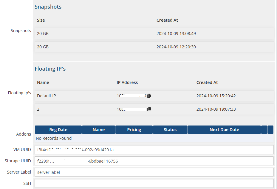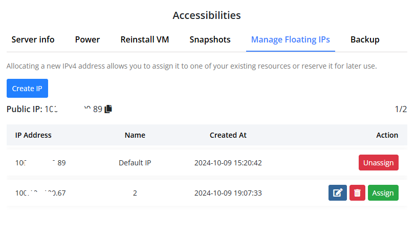 The floating IP management feature allows clients to handle IP addresses associated with their VPS. As the need arises, clients can generate new floating IP addresses, assign or unassign them to their Virtual Private Server (VPS) whenever necessary, and eliminate IPs that are considered obsolete. This flexibility helps clients efficiently manage their IP resources.