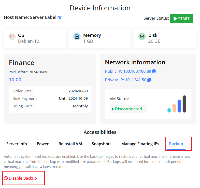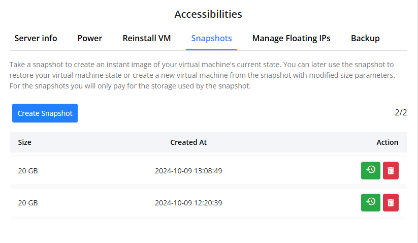 Clients can manage server snapshots vital for backup and recovery operations. They can easily create new snapshots to capture the server’s current state, list existing snapshots for easy reference, delete outdated or unnecessary snapshots to save storage space, and rebuild their virtual machine utilizing a snapshot.