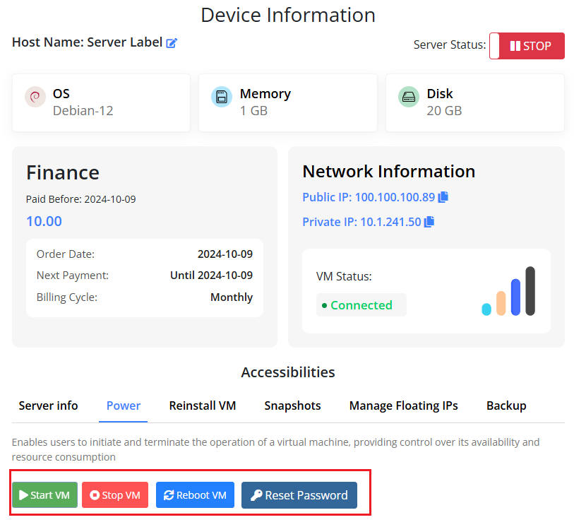 Also, it enables administrators to control the whole operations state of VPS instances. Starting a server boots it up, while stopping it powers it down. This functionality is mostly vital for organizing and managing server availability and conserving resources.