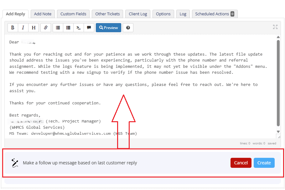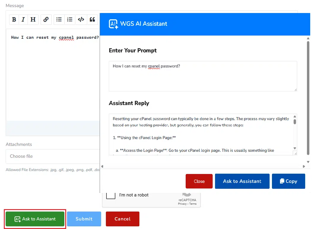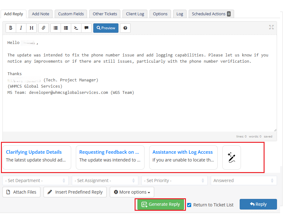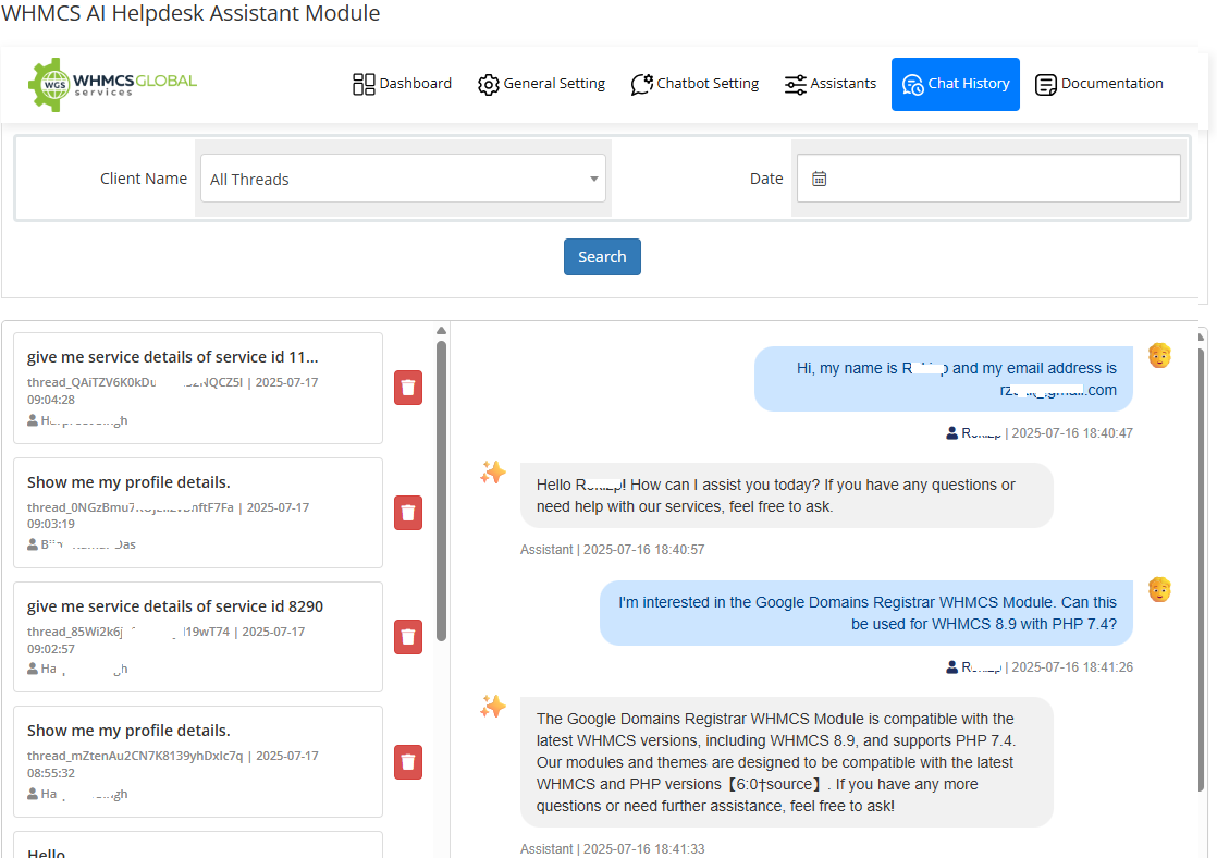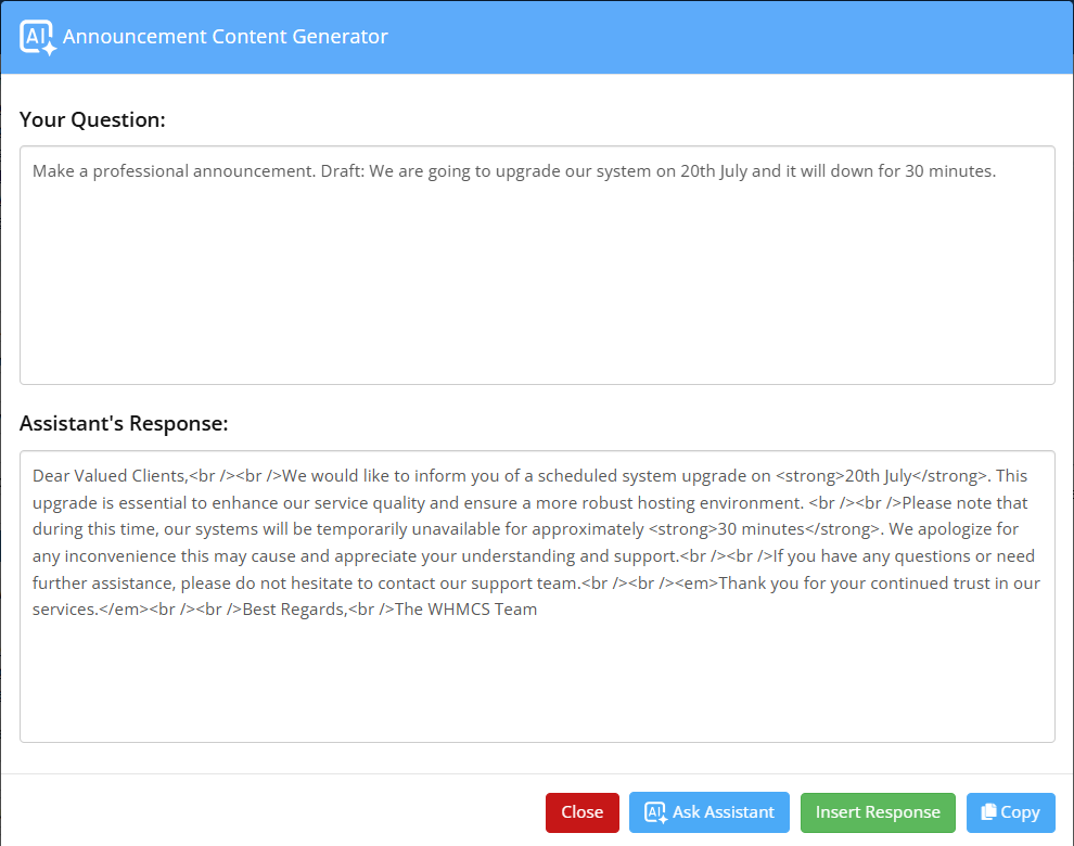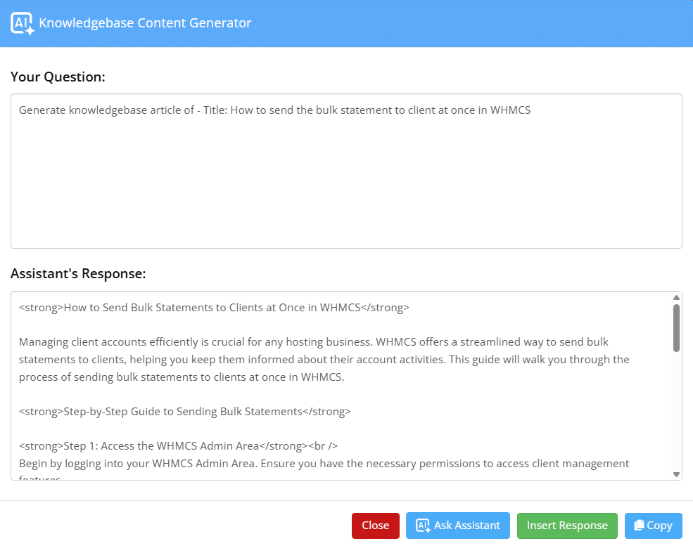 Absolutely. The assistant uses your WHMCS knowledgebase, FAQs, and internal data to generate accurate and context-aware responses.