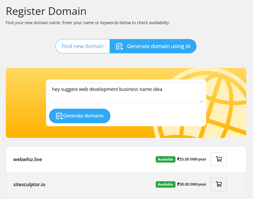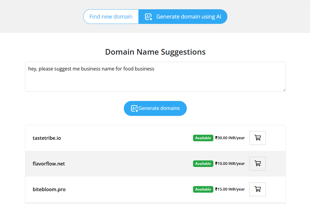 Users can enter keywords or business types, and the assistant will generate relevant, brandable domain names directly from your website using AI.