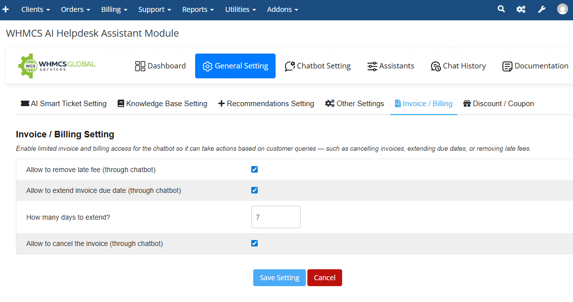 An AI Assistant WHMCS module can handle various inquiries, including billing inquiries, technical support requests, and general customer service inquiries.