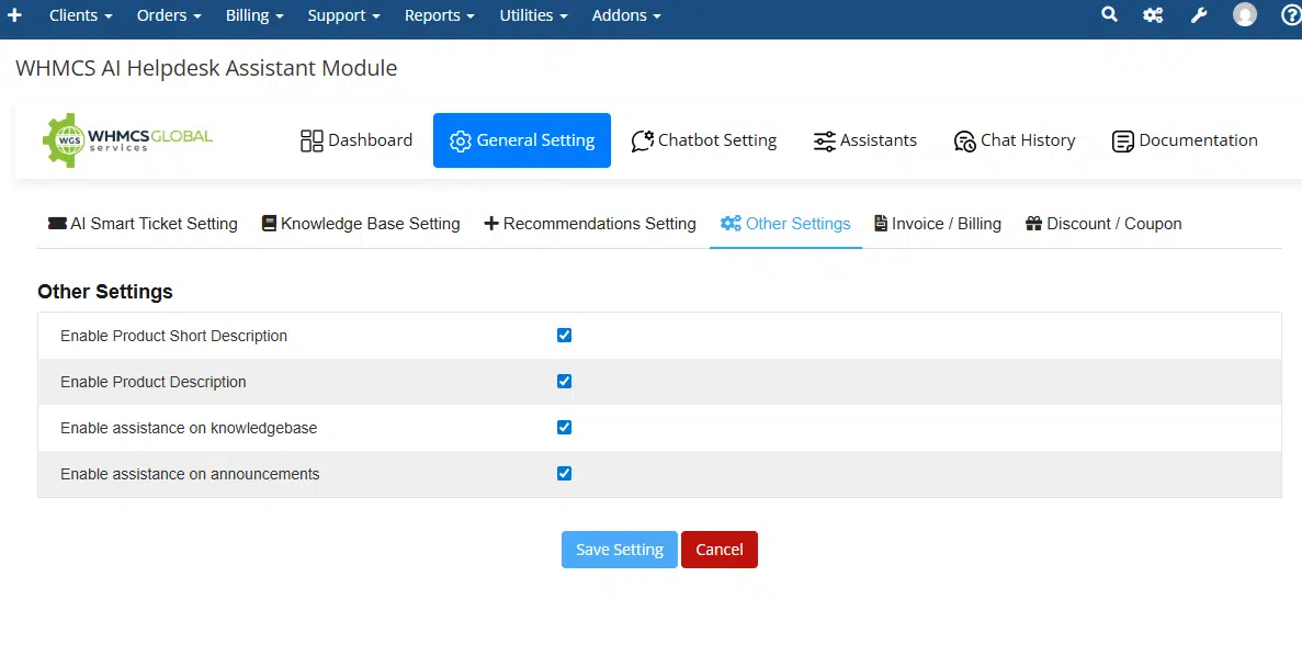 WHMCS AI Helpdesk Assistant Module Deliver smarter, faster customer support with the WHMCS AI Helpdesk Assistant. This powerful module adds an intelligent, real-time chatbot to your website, instantly responding to client queries using your WHMCS knowledgebase, FAQ’s and internal data. It operates 24/7, reduces ticket volume, and improves customer satisfaction.